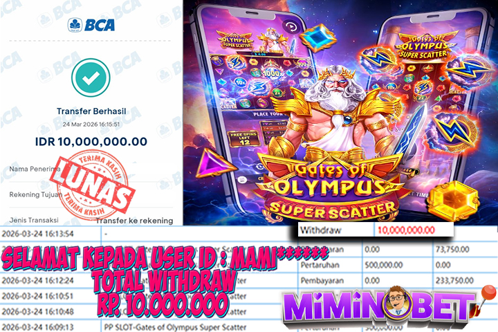 Selamat Kepada User ID : IK**** yang berhasil mendapatkan Kemenangan besar di Pragmatic Play ( Gates of Olympus X-Mas 1000 ) Dengan total kemenangan yang berhasil di peroleh yaitu : Rp 42,300,000,- Bukti transfer kemenangan yang kami posting merupakan bukti yang VALID dan SAH karena di dapatkan langsung dari bukti tanda transaksi dari bank yang di tuju / bersangkutan. Kemenangan telah di proseskan setelah melakukan pengisian ( form / formulir ) withdraw. Sebelumnya kami mengucapkan selamat dan berterima kasih kepada Pemenang, karena telah mempercayai situs MIMINBET sebagai BANDAR terpercaya yang sudah membayarkan semua kemenangan member tanpa sisa hingga lunas. Jadi tunggu apa lagi bosku?! Dimana lagi anda bisa jumpai bandar slot dan togel online terbaik dan amanah seperti MIMINBET ?! Bandar yang membayar kemenangan berapa pun tanpa basa basi dan langsung sat set kelar, sat set selesai ^^ Segera bergabung dengan kami MIMINBET, yang dimana ini adalah situs TERBESAR dan TERPERCAYA , Salam JP dan Salam MIMINBET