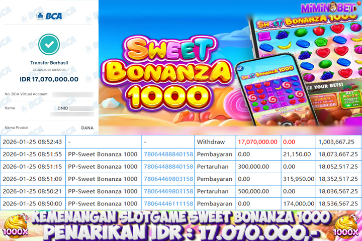 Selamat Kepada User ID : La*****8 yang berhasil mendapatkan Kemenangan besar di SLOTGAME ( PP-Sweet Bonanza 1000 ) Dengan total kemenangan yang berhasil di peroleh yaitu : Rp 17,070,000,- Bukti transfer kemenangan yang kami posting merupakan bukti yang VALID dan SAH karena di dapatkan langsung dari bukti tanda transaksi dari bank yang di tuju / bersangkutan. Kemenangan telah di proseskan setelah melakukan pengisian ( form / formulir ) withdraw. Sebelumnya kami mengucapkan selamat dan berterima kasih kepada Pemenang, karena telah mempercayai situs MIMINBET sebagai BANDAR terpercaya yang sudah membayarkan semua kemenangan member tanpa sisa hingga lunas. Jadi tunggu apa lagi bosku?! Dimana lagi anda bisa jumpai bandar slot dan togel online terbaik dan amanah seperti MIMINBET ?! Bandar yang membayar kemenangan berapa pun tanpa basa basi dan langsung sat set kelar, sat set selesai ^^ Segera bergabung dengan kami MIMINBET, yang dimana ini adalah situs TERBESAR dan TERPERCAYA , Salam JP dan Salam MIMINBET