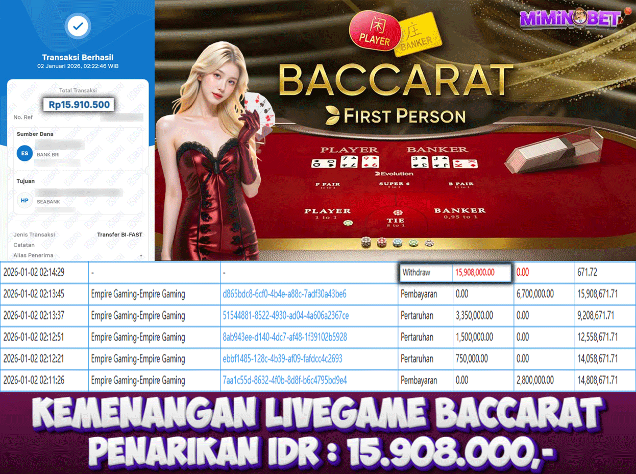 Selamat Kepada User ID : Si*****3 yang berhasil mendapatkan Kemenangan besar di LIVEGAME ( Empire Gaming-BACCARAT ) Dengan total kemenangan yang berhasil di peroleh yaitu : Rp 11,152,000,- Bukti transfer kemenangan yang kami posting merupakan bukti yang VALID dan SAH karena di dapatkan langsung dari bukti tanda transaksi dari bank yang di tuju / bersangkutan. Kemenangan telah di proseskan setelah melakukan pengisian ( form / formulir ) withdraw. Sebelumnya kami mengucapkan selamat dan berterima kasih kepada Pemenang, karena telah mempercayai situs MIMINBET sebagai BANDAR terpercaya yang sudah membayarkan semua kemenangan member tanpa sisa hingga lunas. Jadi tunggu apa lagi bosku?! Dimana lagi anda bisa jumpai bandar slot dan togel online terbaik dan amanah seperti MIMINBET ?! Bandar yang membayar kemenangan berapa pun tanpa basa basi dan langsung sat set kelar, sat set selesai ^^ Segera bergabung dengan kami MIMINBET, yang dimana ini adalah situs TERBESAR dan TERPERCAYA , Salam JP dan Salam MIMINBET