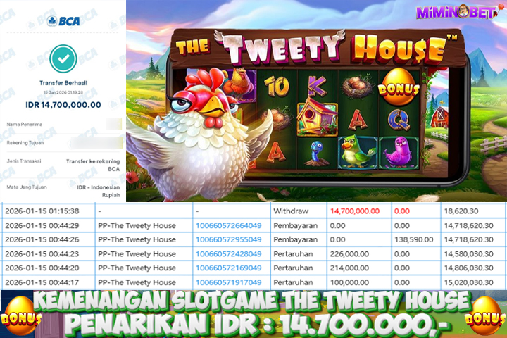 Selamat Kepada User ID : Ed****g yang berhasil mendapatkan Kemenangan besar di SLOTGAME ( PP-The Tweety House ) Dengan total kemenangan yang berhasil di peroleh yaitu : Rp 14,700,000,- Bukti transfer kemenangan yang kami posting merupakan bukti yang VALID dan SAH karena di dapatkan langsung dari bukti tanda transaksi dari bank yang di tuju / bersangkutan. Kemenangan telah di proseskan setelah melakukan pengisian ( form / formulir ) withdraw. Sebelumnya kami mengucapkan selamat dan berterima kasih kepada Pemenang, karena telah mempercayai situs MIMINBET sebagai BANDAR terpercaya yang sudah membayarkan semua kemenangan member tanpa sisa hingga lunas. Jadi tunggu apa lagi bosku?! Dimana lagi anda bisa jumpai bandar slot dan togel online terbaik dan amanah seperti MIMINBET ?! Bandar yang membayar kemenangan berapa pun tanpa basa basi dan langsung sat set kelar, sat set selesai ^^ Segera bergabung dengan kami MIMINBET, yang dimana ini adalah situs TERBESAR dan TERPERCAYA , Salam JP dan Salam MIMINBET