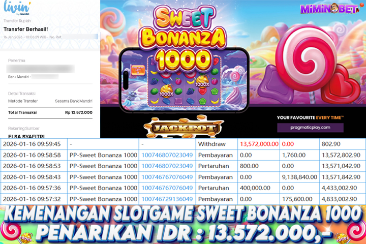 Selamat Kepada User ID : Pit**********1 yang berhasil mendapatkan Kemenangan besar di SLOTGAME ( PP-Sweet Bonanza 1000 ) Dengan total kemenangan yang berhasil di peroleh yaitu : Rp 13,572,000,- Bukti transfer kemenangan yang kami posting merupakan bukti yang VALID dan SAH karena di dapatkan langsung dari bukti tanda transaksi dari bank yang di tuju / bersangkutan. Kemenangan telah di proseskan setelah melakukan pengisian ( form / formulir ) withdraw. Sebelumnya kami mengucapkan selamat dan berterima kasih kepada Pemenang, karena telah mempercayai situs MIMINBET sebagai BANDAR terpercaya yang sudah membayarkan semua kemenangan member tanpa sisa hingga lunas. Jadi tunggu apa lagi bosku?! Dimana lagi anda bisa jumpai bandar slot dan togel online terbaik dan amanah seperti MIMINBET ?! Bandar yang membayar kemenangan berapa pun tanpa basa basi dan langsung sat set kelar, sat set selesai ^^ Segera bergabung dengan kami MIMINBET, yang dimana ini adalah situs TERBESAR dan TERPERCAYA , Salam JP dan Salam MIMINBET