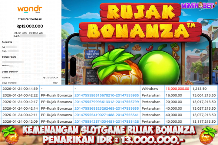 Selamat Kepada User ID : La****o yang berhasil mendapatkan Kemenangan besar di SLOTGAME ( PP-Rujak Bonanza ) Dengan total kemenangan yang berhasil di peroleh yaitu : Rp 13,000,000,- Bukti transfer kemenangan yang kami posting merupakan bukti yang VALID dan SAH karena di dapatkan langsung dari bukti tanda transaksi dari bank yang di tuju / bersangkutan. Kemenangan telah di proseskan setelah melakukan pengisian ( form / formulir ) withdraw. Sebelumnya kami mengucapkan selamat dan berterima kasih kepada Pemenang, karena telah mempercayai situs MIMINBET sebagai BANDAR terpercaya yang sudah membayarkan semua kemenangan member tanpa sisa hingga lunas. Jadi tunggu apa lagi bosku?! Dimana lagi anda bisa jumpai bandar slot dan togel online terbaik dan amanah seperti MIMINBET ?! Bandar yang membayar kemenangan berapa pun tanpa basa basi dan langsung sat set kelar, sat set selesai ^^ Segera bergabung dengan kami MIMINBET, yang dimana ini adalah situs TERBESAR dan TERPERCAYA , Salam JP dan Salam MIMINBET