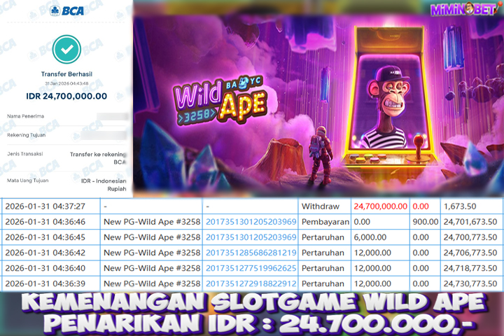 Selamat Kepada User ID : Spe********1 yang berhasil mendapatkan Kemenangan besar di SLOTGAME ( PG-Wild Ape #3258 ) Dengan total kemenangan yang berhasil di peroleh yaitu : Rp 24,700,000,- Bukti transfer kemenangan yang kami posting merupakan bukti yang VALID dan SAH karena di dapatkan langsung dari bukti tanda transaksi dari bank yang di tuju / bersangkutan. Kemenangan telah di proseskan setelah melakukan pengisian ( form / formulir ) withdraw. Sebelumnya kami mengucapkan selamat dan berterima kasih kepada Pemenang, karena telah mempercayai situs MIMINBET sebagai BANDAR terpercaya yang sudah membayarkan semua kemenangan member tanpa sisa hingga lunas. Jadi tunggu apa lagi bosku?! Dimana lagi anda bisa jumpai bandar slot dan togel online terbaik dan amanah seperti MIMINBET ?! Bandar yang membayar kemenangan berapa pun tanpa basa basi dan langsung sat set kelar, sat set selesai ^^ Segera bergabung dengan kami MIMINBET, yang dimana ini adalah situs TERBESAR dan TERPERCAYA , Salam JP dan Salam MIMINBET