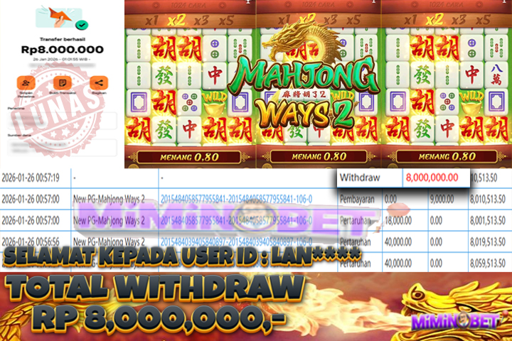 Selamat Kepada User ID : Lan**** yang berhasil mendapatkan Kemenangan besar di SLOTGAME ( New PG-Mahjong Ways 2 ) Dengan total kemenangan yang berhasil di peroleh yaitu : Rp 8,000,000,- Bukti transfer kemenangan yang kami posting merupakan bukti yang VALID dan SAH karena di dapatkan langsung dari bukti tanda transaksi dari bank yang di tuju / bersangkutan. Kemenangan telah di proseskan setelah melakukan pengisian ( form / formulir ) withdraw. Sebelumnya kami mengucapkan selamat dan berterima kasih kepada Pemenang, karena telah mempercayai situs MIMINBET sebagai BANDAR terpercaya yang sudah membayarkan semua kemenangan member tanpa sisa hingga lunas. Jadi tunggu apa lagi bosku?! Dimana lagi anda bisa jumpai bandar slot dan togel online terbaik dan amanah seperti MIMINBET ?! Bandar yang membayar kemenangan berapa pun tanpa basa basi dan langsung sat set kelar, sat set selesai ^^ Segera bergabung dengan kami MIMINBET, yang dimana ini adalah situs TERBESAR dan TERPERCAYA , Salam JP dan Salam MIMINBET