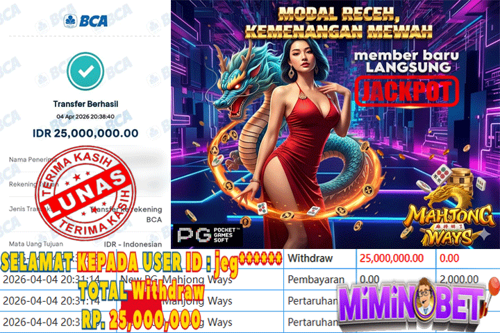Selamat Kepada User ID : IE**** yang berhasil mendapatkan Kemenangan besar di PG Soft ( Geisha Revenge ) Dengan total kemenangan yang berhasil di peroleh yaitu : Rp 21,008,000,- Bukti transfer kemenangan yang kami posting merupakan bukti yang VALID dan SAH karena di dapatkan langsung dari bukti tanda transaksi dari bank yang di tuju / bersangkutan. Kemenangan telah di proseskan setelah melakukan pengisian ( form / formulir ) withdraw. Sebelumnya kami mengucapkan selamat dan berterima kasih kepada Pemenang, karena telah mempercayai situs MIMINBET sebagai BANDAR terpercaya yang sudah membayarkan semua kemenangan member tanpa sisa hingga lunas. Jadi tunggu apa lagi bosku?! Dimana lagi anda bisa jumpai bandar slot dan togel online terbaik dan amanah seperti MIMINBET ?! Bandar yang membayar kemenangan berapa pun tanpa basa basi dan langsung sat set kelar, sat set selesai ^^ Segera bergabung dengan kami MIMINBET, yang dimana ini adalah situs TERBESAR dan TERPERCAYA , Salam JP dan Salam MIMINBET