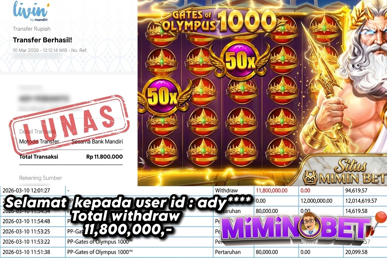 Selamat Kepada User ID : ady*** yang berhasil mendapatkan Kemenangan besar di Pragmatic Play ( Gates Of Olympus 1000 ) Dengan total kemenangan yang berhasil di peroleh yaitu : Rp 11,800,000,- Bukti transfer kemenangan yang kami posting merupakan bukti yang VALID dan SAH karena di dapatkan langsung dari bukti tanda transaksi dari bank yang di tuju / bersangkutan. Kemenangan telah di proseskan setelah melakukan pengisian ( form / formulir ) withdraw. Sebelumnya kami mengucapkan selamat dan berterima kasih kepada Pemenang, karena telah mempercayai situs MIMINBET sebagai BANDAR terpercaya yang sudah membayarkan semua kemenangan member tanpa sisa hingga lunas. Jadi tunggu apa lagi bosku?! Dimana lagi anda bisa jumpai bandar slot dan togel online terbaik dan amanah seperti MIMINBET ?! Bandar yang membayar kemenangan berapa pun tanpa basa basi dan langsung sat set kelar, sat set selesai ^^ Segera bergabung dengan kami MIMINBET, yang dimana ini adalah situs TERBESAR dan TERPERCAYA , Salam JP dan Salam MIMINBET