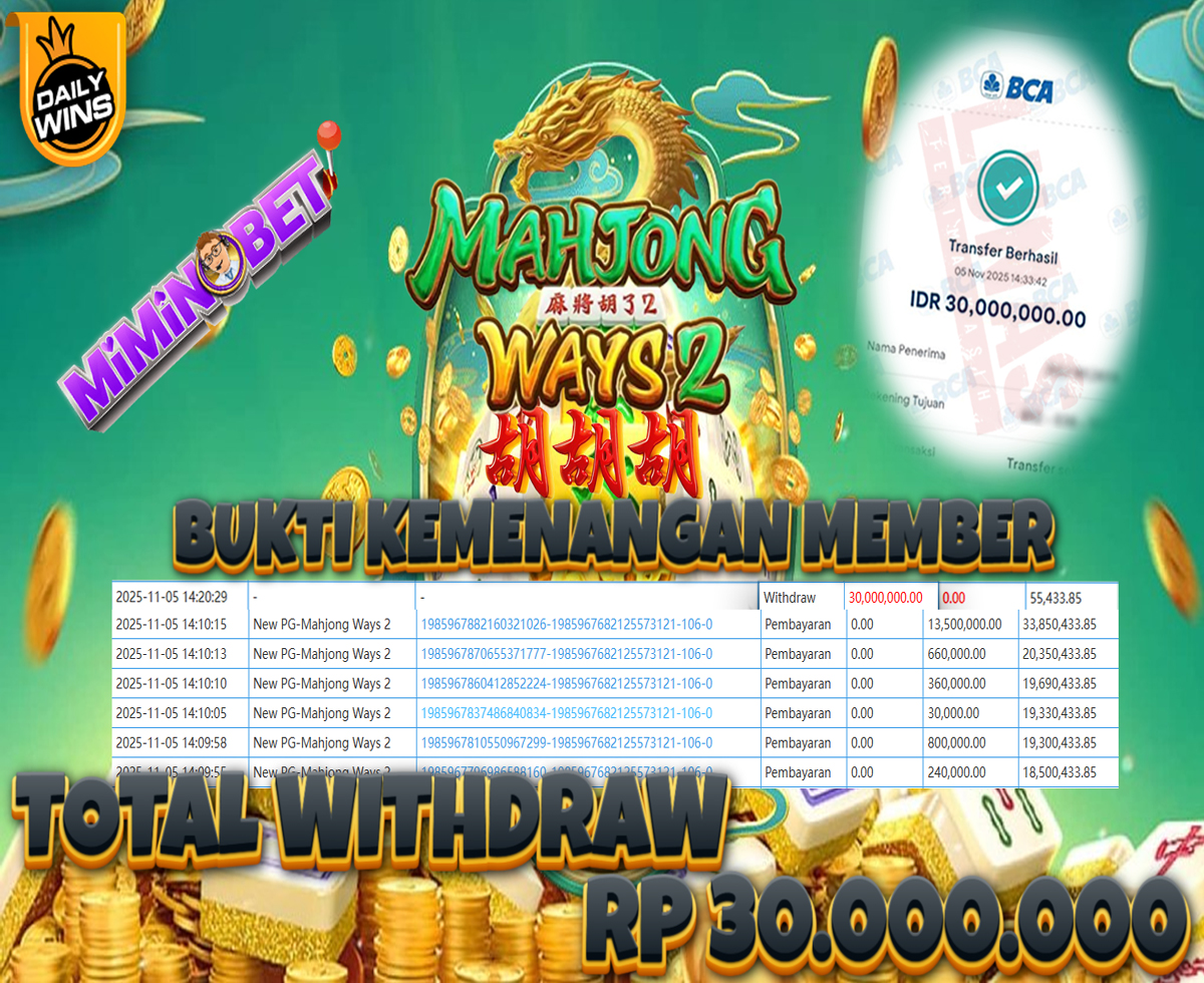 Selamat Kepada User ID : J****jy yang berhasil mendapatkan Kemenangan besar di SlotGame( MahjongWays 2) Dengan total kemenangan yang berhasil di peroleh yaitu : Rp 30,000,000,- Bukti transfer kemenangan yang kami posting merupakan bukti yang VALID dan SAH karena di dapatkan langsung dari bukti tanda transaksi dari bank yang di tuju / bersangkutan. Kemenangan telah di proseskan setelah melakukan pengisian ( form / formulir ) withdraw. Sebelumnya kami mengucapkan selamat dan berterima kasih kepada Pemenang, karena telah mempercayai situs MIMINBET sebagai BANDAR terpercaya yang sudah membayarkan semua kemenangan member tanpa sisa hingga lunas. Jadi tunggu apa lagi bosku?! Dimana lagi anda bisa jumpai bandar slot dan togel online terbaik dan amanah seperti MIMINBET ?! Bandar yang membayar kemenangan berapa pun tanpa basa basi dan langsung sat set kelar, sat set selesai ^^ Segera bergabung dengan kami MIMINBET, yang dimana ini adalah situs TERBESAR dan TERPERCAYA , Salam JP dan Salam MIMINBET ^^