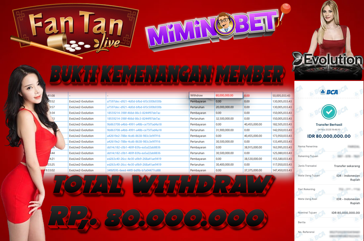 Selamat Kepada User ID : Jc*****at yang berhasil mendapatkan Kemenangan besar di LIVEGAMES( EvoLive2-Evolution ) Dengan total kemenangan yang berhasil di peroleh yaitu : Rp 80,000,000,- Bukti transfer kemenangan yang kami posting merupakan bukti yang VALID dan SAH karena di dapatkan langsung dari bukti tanda transaksi dari bank yang di tuju / bersangkutan. Kemenangan telah di proseskan setelah melakukan pengisian ( form / formulir ) withdraw. Sebelumnya kami mengucapkan selamat dan berterima kasih kepada Pemenang, karena telah mempercayai situs MIMINBET sebagai BANDAR terpercaya yang sudah membayarkan semua kemenangan member tanpa sisa hingga lunas. Jadi tunggu apa lagi bosku?! Dimana lagi anda bisa jumpai bandar slot dan togel online terbaik dan amanah seperti MIMINBET ?! Bandar yang membayar kemenangan berapa pun tanpa basa basi dan langsung sat set kelar, sat set selesai ^^ Segera bergabung dengan kami MIMINBET, yang dimana ini adalah situs TERBESAR dan TERPERCAYA , Salam JP dan Salam MIMINBET ^^